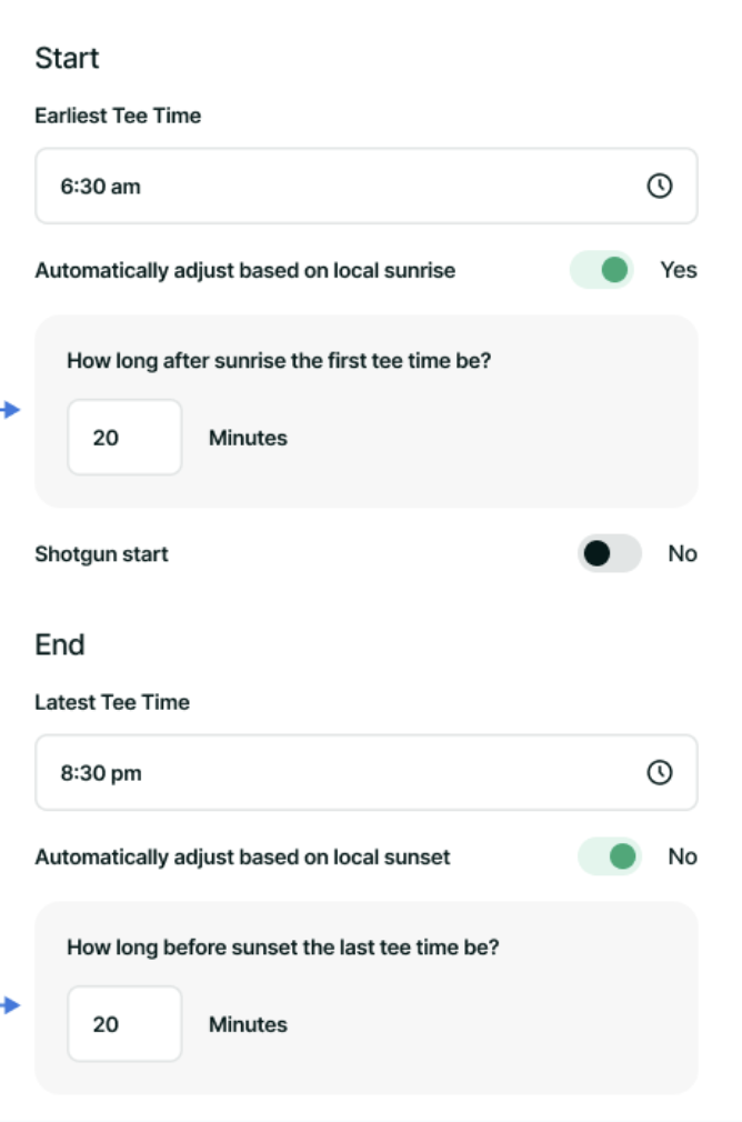 Say goodbye to seasonal tee sheet edits. With our new Sunrise & Sunset settings, golf agendas can now auto-adjust start and end times based on your club’s local sunrise and sunset times. Just set how many minutes after sunrise you'd like the day to begin and how long before sunset you'd like it to end, Whoosh will handle the rest.