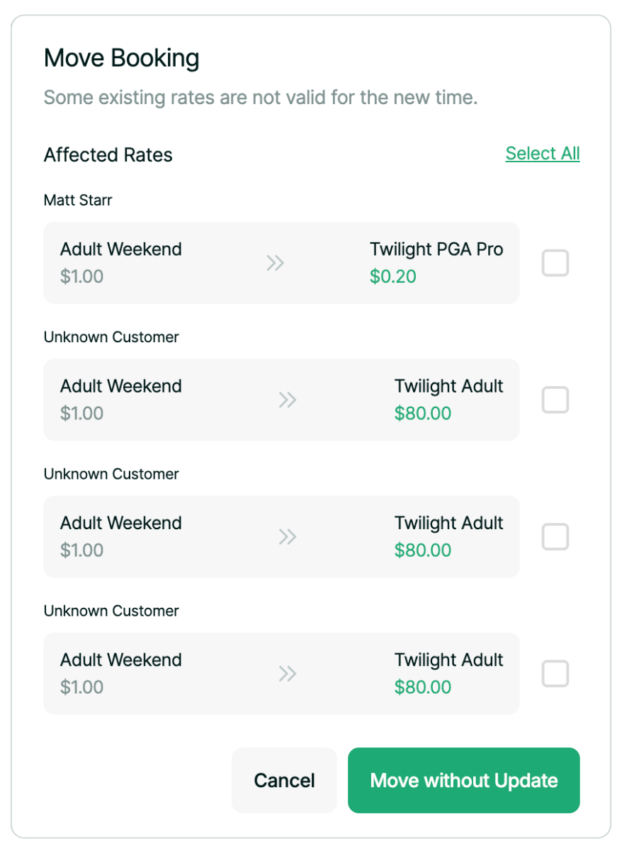 New Rate Pop-up – A new rate modal, pictured, helps ensure accurate pricing if the booking crosses into a different rate period, giving staff the option to keep the original rate or update to the new one. This pop-up will also appear for customers, alerting them of a new rate, but they will not have the ability to change it themselves.